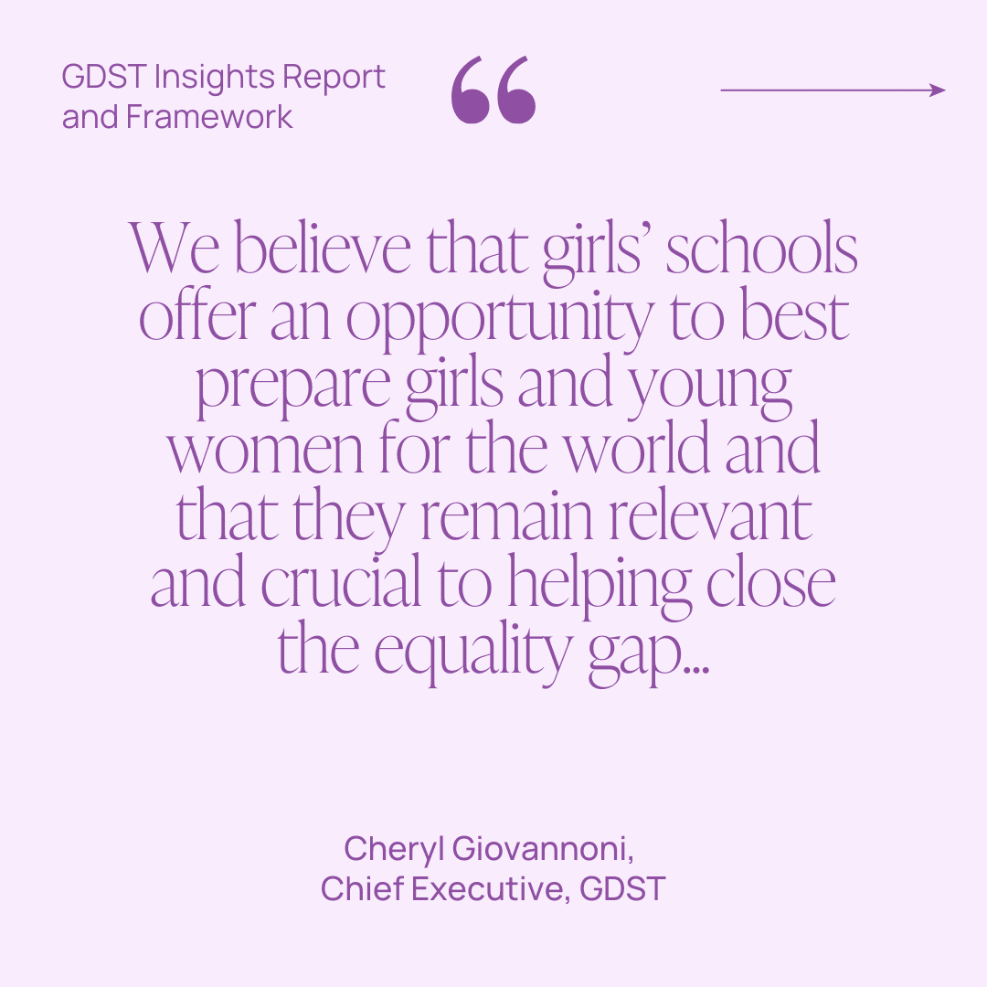The role of girls’ education has never been more relevant in order to accelerate the pace of change. This is why we have built on the findings of our landmark 2022 ‘Girls’ Futures Report’, which highlighted the aspirations of girls and the barriers they face, to develop the Designing the Future of Girls’ Education, a GDST Insights Report and Framework. This report and framework provides thought-provoking and practical tools designed to inform and empower families, teachers and the entire educational community to understand how girls learn best and to challenge the structures and mindsets in schools that short-change female pupils.
